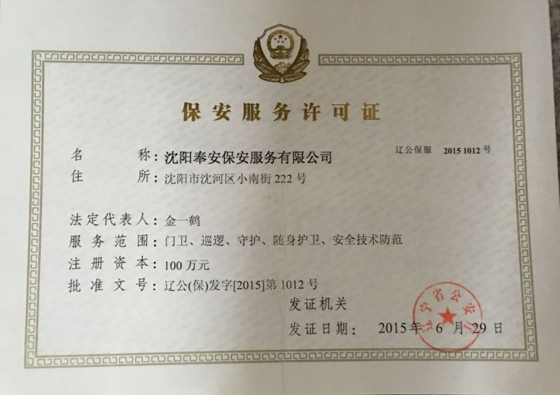 沈陽奉安保安服務有限公司(原沈陽市沈河區(qū)保安服務公司)創(chuàng)建于一九八八年八月,是遼寧省公安廳、沈陽市公安局批準,工商行政部門登記注冊,全市首家具備保安資質的特殊性服務企業(yè),隸屬于沈陽市沈河區(qū)政府直管的全民國有企業(yè),現(xiàn)為中國保安協(xié)會會員單位和省保協(xié)、市保協(xié)常務理事單位:在全市同行業(yè)中率先通過ISO國際質量認證,是市工商局批準的“重合同守信用”免檢單位和沈陽市政府采購中心保安服務項目重點競標單位;擁有一支專業(yè)化、標準化、職業(yè)化的高素質保安隊伍,是公安機關重要的輔警力量。